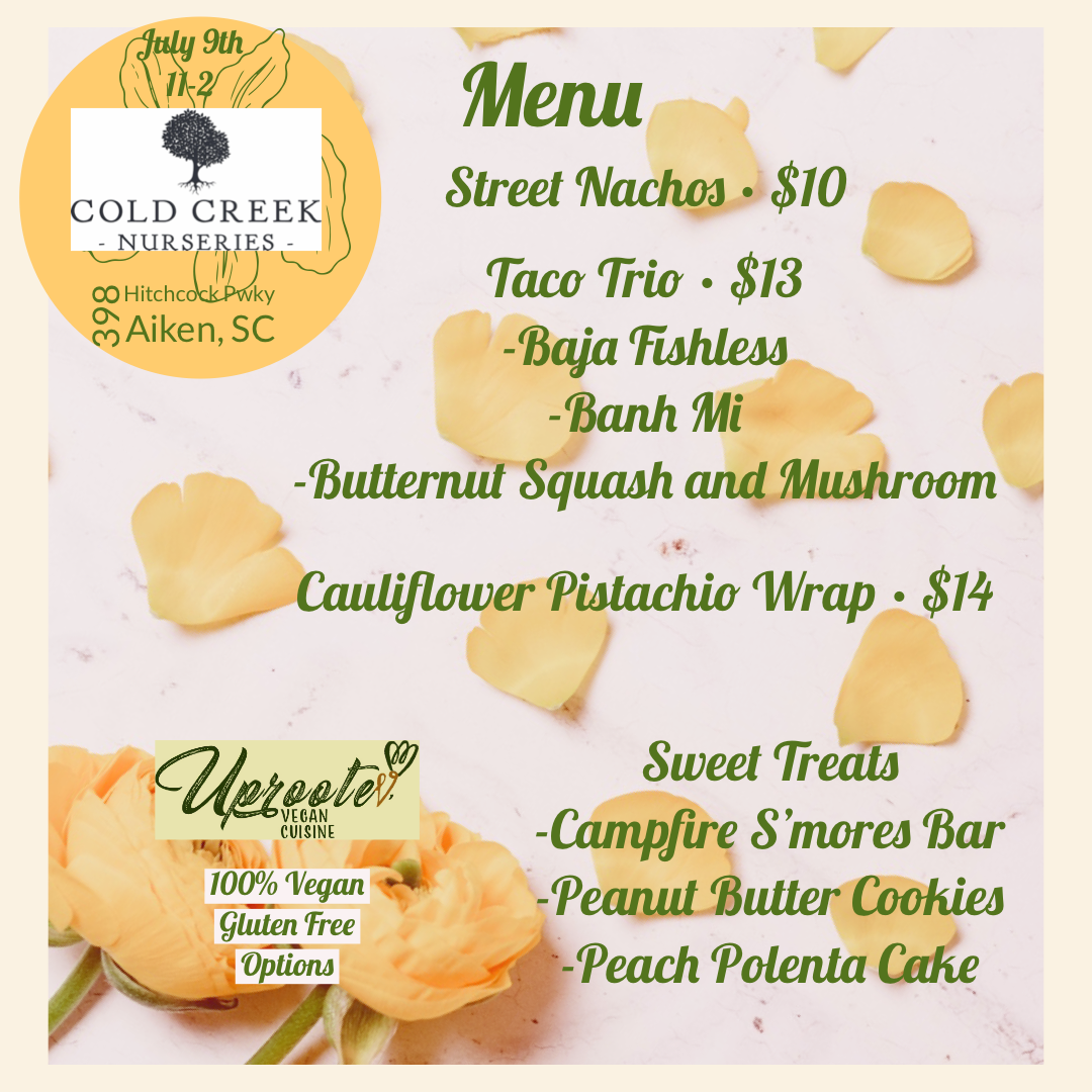 Uprooted will be serving some of their most popular Eats and Sweets from this summer’s events menu featuring locally sourced, seasonal produce from CSRA based farmers. All items are vegan (no eggs, dairy or animal byproducts) and offer a gluten free option as well.